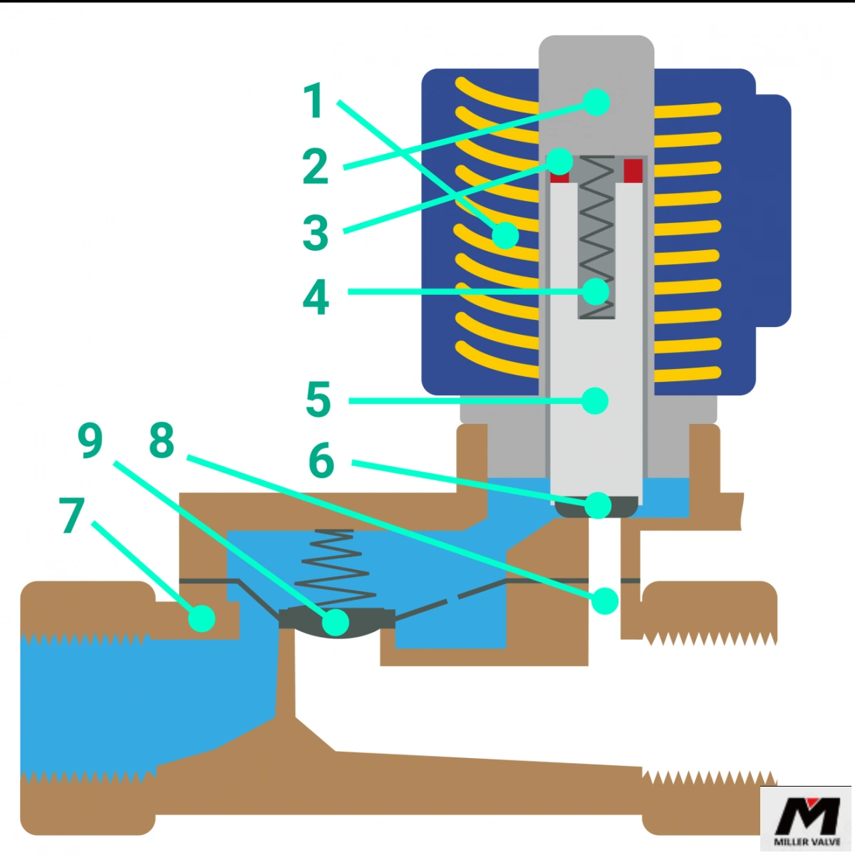 1) 線圈 2) 電樞 3) 屏蔽環(huán) 4) 彈簧 5) 柱塞 6) 密封件 7) 閥體 8) 閥體節(jié)流孔 9) 隔膜